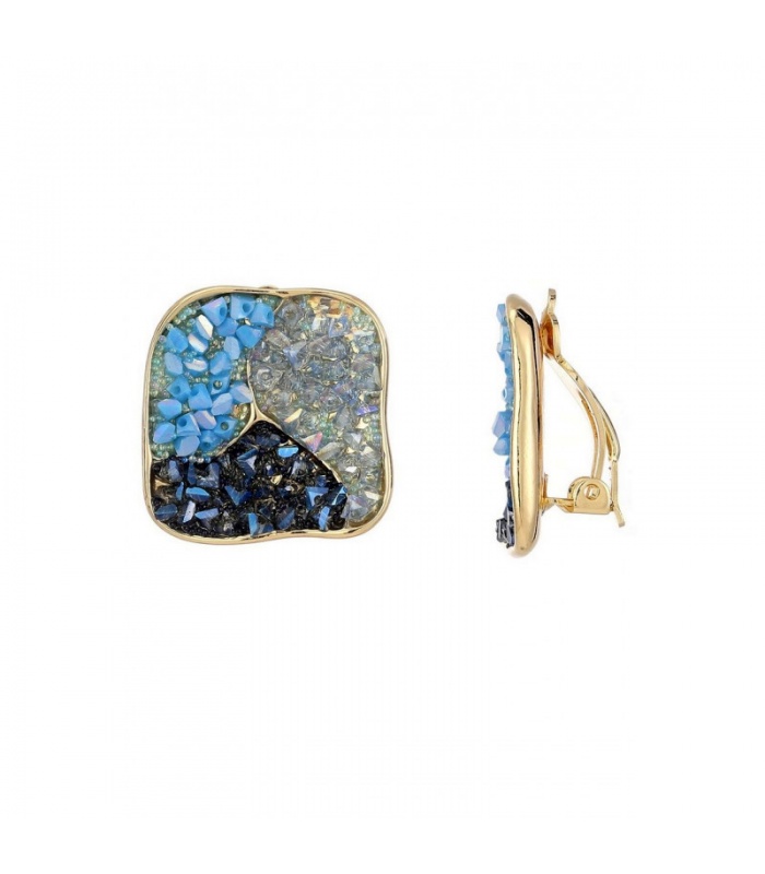 Op zoek naar oorclips die opvallen door kleur en vorm? Deze vierkante oorclips zijn versierd met een mozaïek van glinsterende steentjes in blauw, zwart en zilver. De speelse compositie in goudkleurige omlijsting maakt elke look bijzonder.