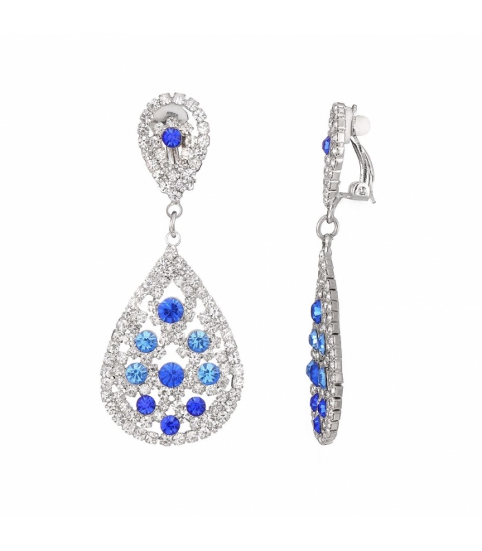 Zilverkleurige oorclips met heldere blauwe strass steentjes