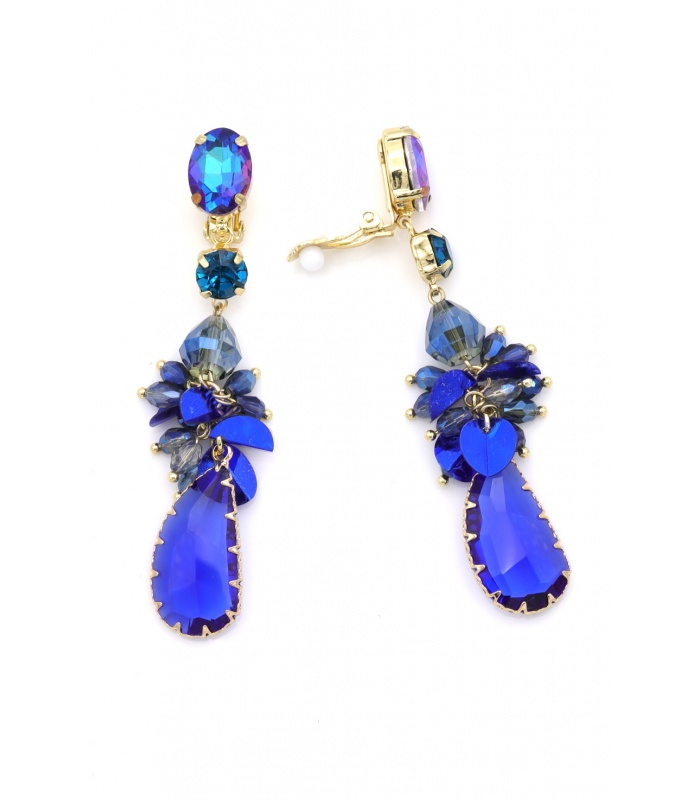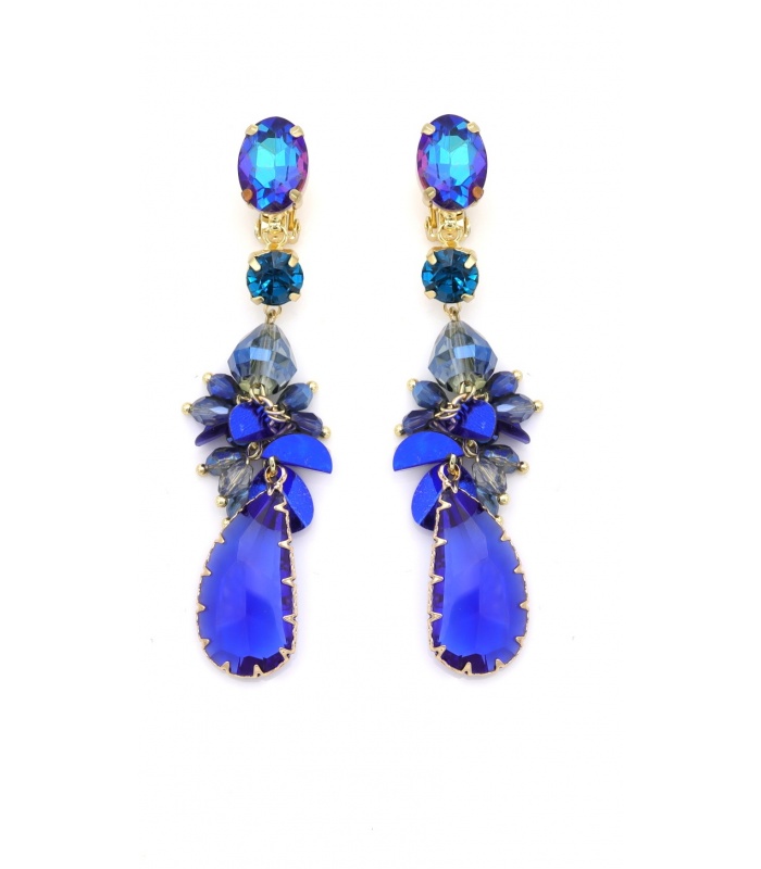 De mix van glanzende kralen, bloemblaadjes en een royale druppelvormige steen geeft deze oorclips een dynamische, bijna bloemachtige compositie. Fashion liefhebbers zullen de combinatie van helderblauw waarderen de trendkleuren in sieraden. Perfect voor wie durft op te vallen.