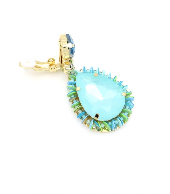 Hoe laat je jouw look sprankelen met kleur? Deze oorclips combineren een grote druppelvormige steen in helder turquoise met een rand van groene en blauwe accenten. De bovenzijde is versierd met fonkelende kristallen in verschillende blauwtinten voor een luxueuze uitstraling.