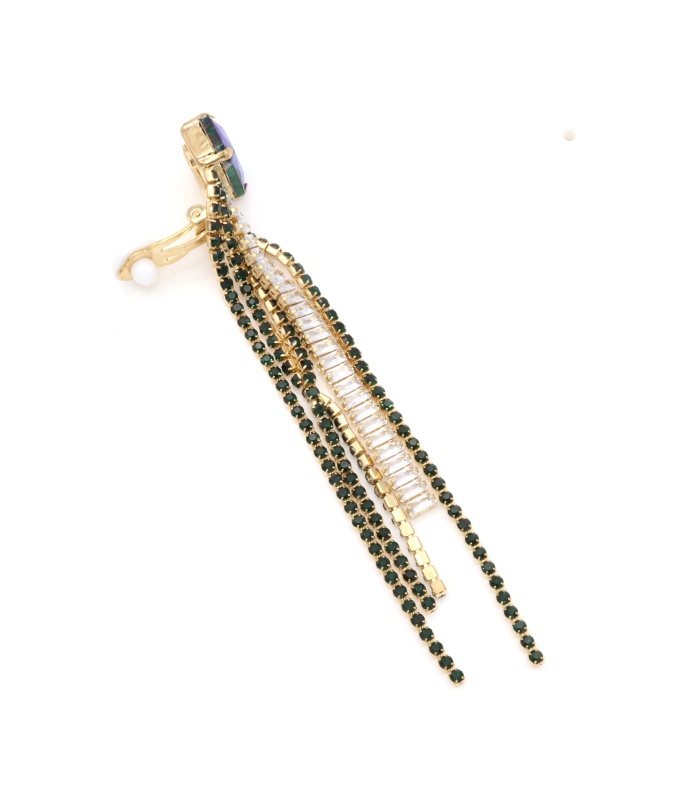 Hoe steel je moeiteloos de show? Met deze oorclips die fonkelen bij elke stap. De felblauwe steen vormt het stralende middelpunt, terwijl de lange strengen met smaragdgroene en transparante steentjes voor dynamiek zorgen. Dé keuze voor avondlooks of feestelijke gelegenheden.