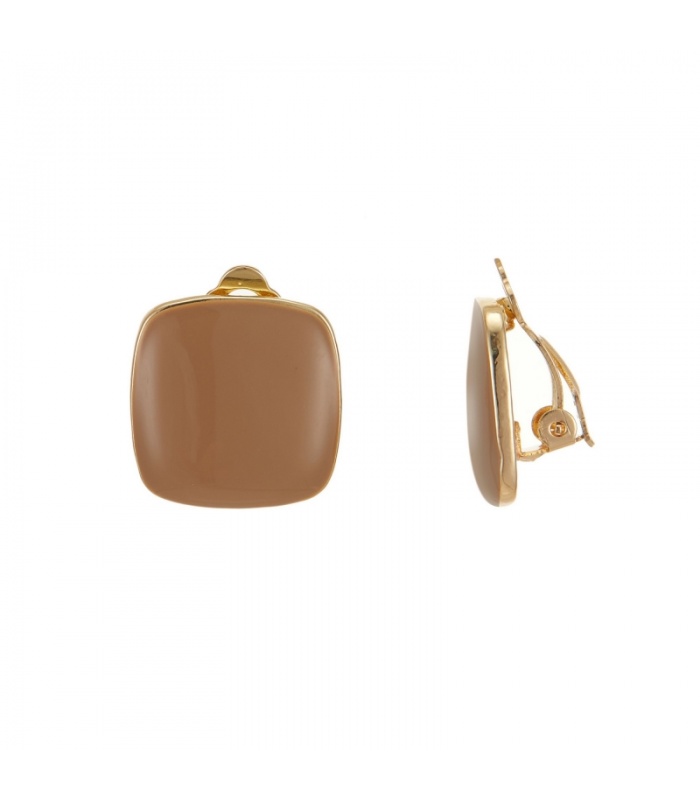 Bruine vierkante oorclips in goudkleurige zetting van Belle Miss.
