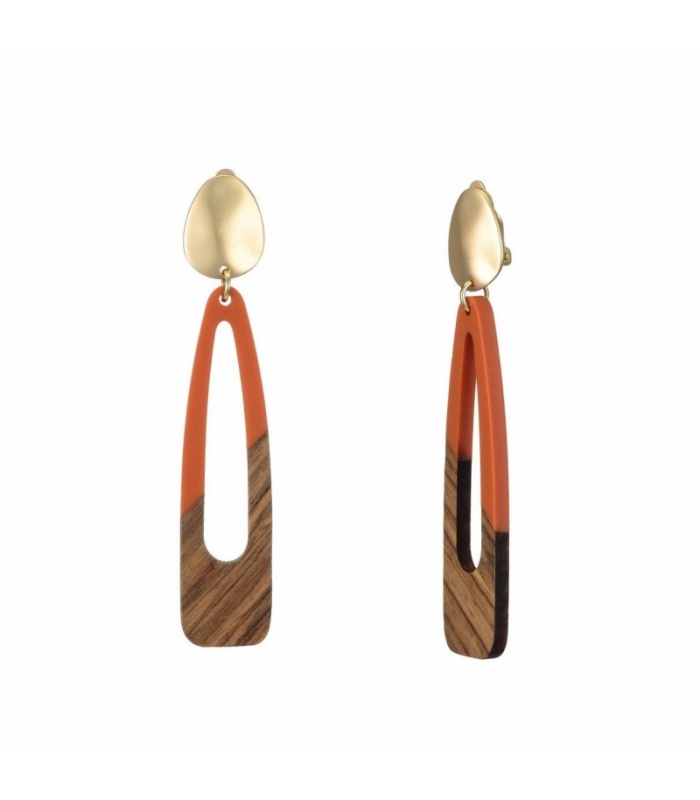 Oorclips met een oranjebruine langwerpige deels houten hanger