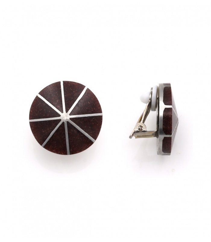 Zoek je oorclips die retro en modern uitstralen? Deze ronde oorclips met diepbruine tint en zilverkleurige lijnen geven een krachtig grafisch effect. De symmetrische verdeling doet denken aan art deco, maar met een eigentijdse twist. Een echte blikvanger bij zowel casual als zakelijke outfits.