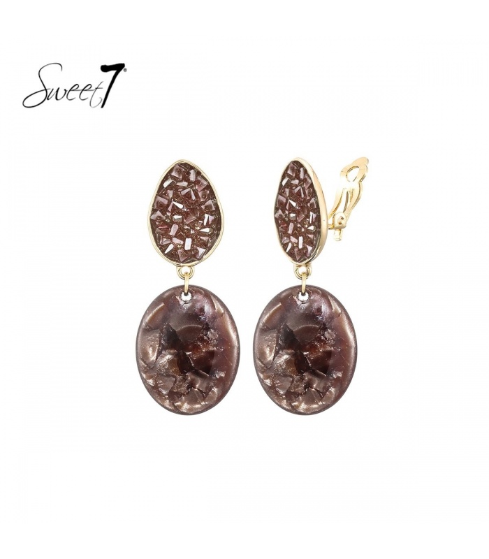 Deze bruine oorclips vormen de perfecte balans tussen natuurlijke tinten en een stijlvolle uitstraling. De ovale hanger heeft een marmerachtige glans, terwijl de bovenkant is bezet met glinsterende glas stukjes. Ideaal voor wie op zoek is naar fashion oorbellen met een warme, elegante touch.