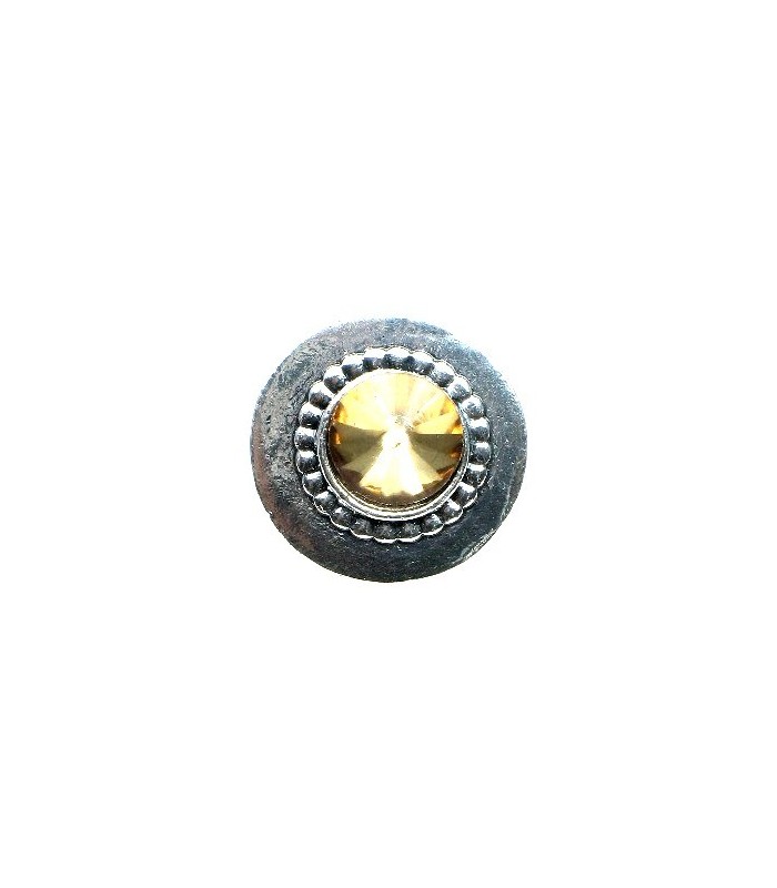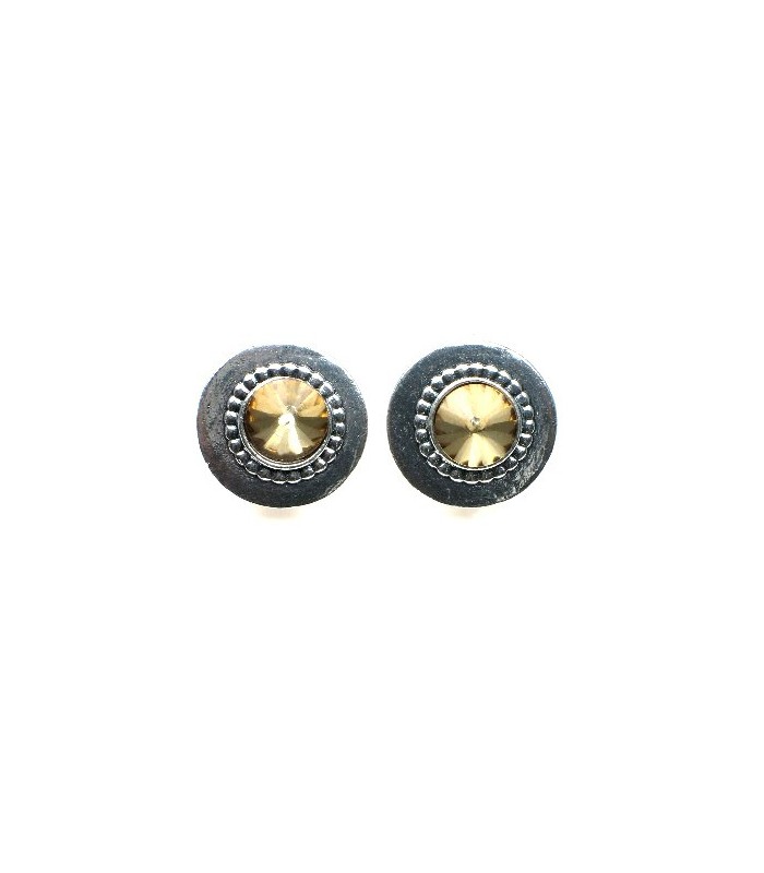 Oorclips met zilverkleurige rand met bruin oranje strassteen. De achterzijde van de clipoorbel is zilverkleurig. De diameter van de oorbel is 2 cm.