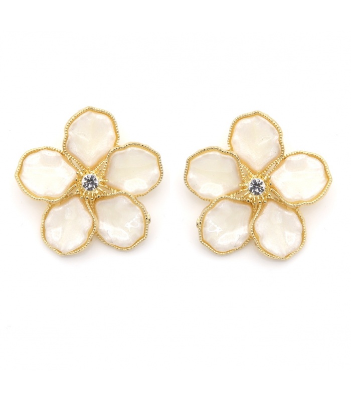 Hoe voeg je een vleugje elegantie toe zonder te overdrijven? Deze bloemen oorclips combineren zachte parelmoertinten met goudkleurige accenten voor een verfijnde uitstraling. De kristallen kern geeft net genoeg sparkle voor een chique look. Perfect voor elke gelegenheid waarbij stijl telt.