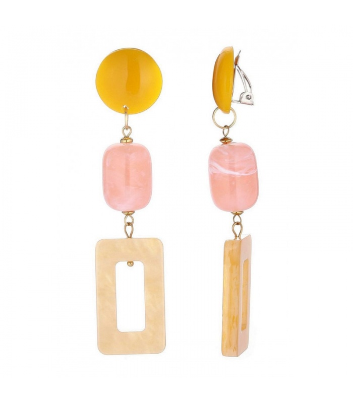 Wil je je outfit een speelse twist geven? Deze oorclips combineren een glanzende gele knop, een zachtroze kraal met marmer effect en een open rechthoekige hanger in warme beige tint. Een vrolijke blikvanger voor elke gelegenheid.