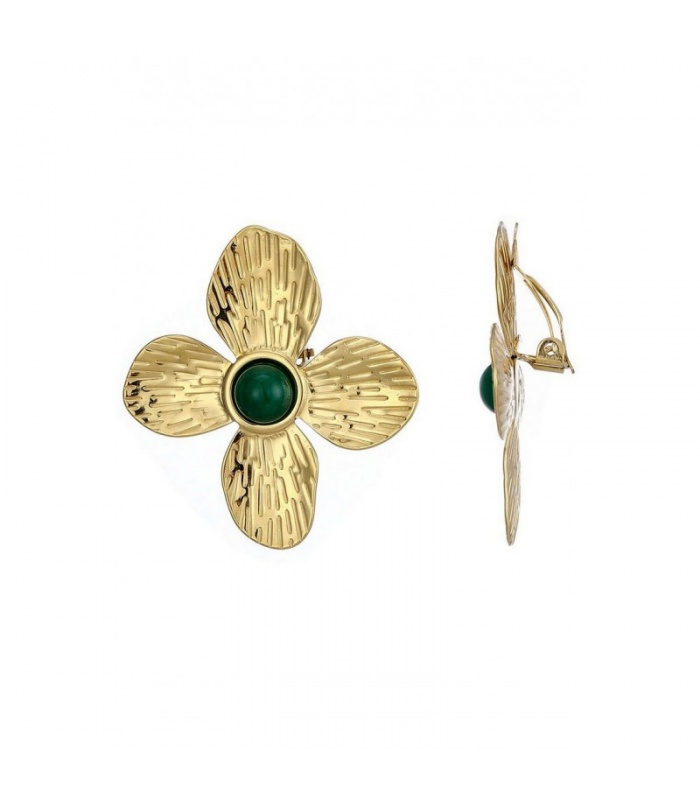 Deze goudkleurige oorclips in bloemvorm zijn voorzien van een schitterend groen steentje, wat zorgt voor een frisse en elegante uitstraling. De oorbellen zijn perfect voor zowel dagelijkse outfits als speciale gelegenheden, en voegen een vleugje glamour toe aan elke look.