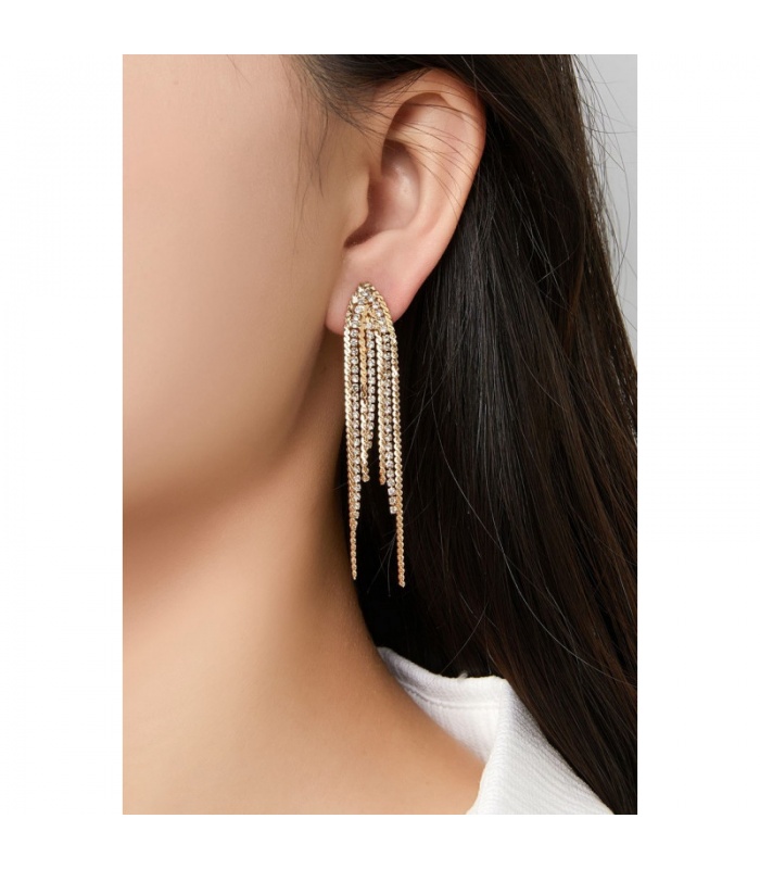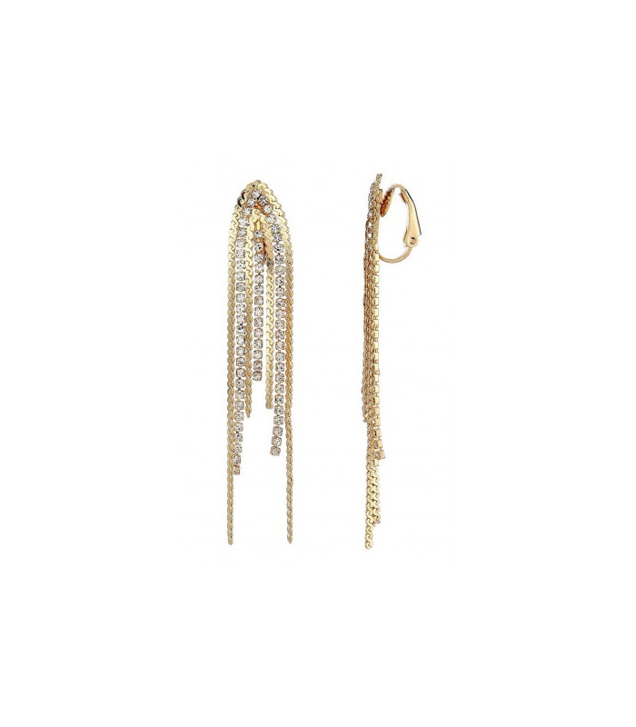 Wil je opvallen met een elegante maar krachtige touch? Deze goudkleurige oorclips combineren schitterende strass steentjes met soepel vallende kettingen voor een sprankelend effect. De combinatie van glans en lengte maakt ze ideaal voor feestelijke gelegenheden of een chique avondlook.
