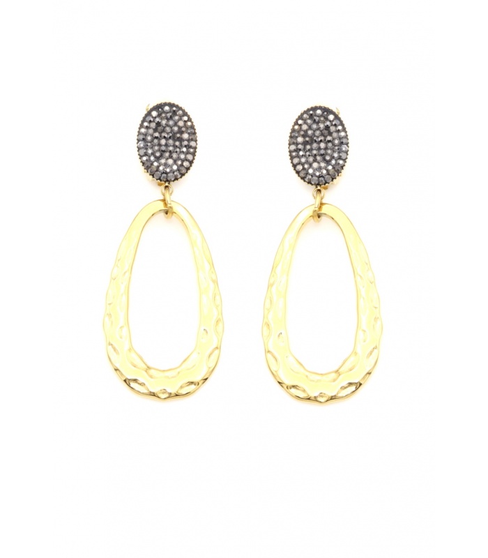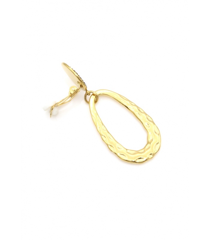 Oorclips met bewerkte hanger en een donker strass steentje in het oor stukje geven je outfit direct een elegant accent. Fashion accessory die glamour en moderniteit combineert. Zacht goud en donkere glitter zorgen voor een chic contrast dat van dag tot avond past