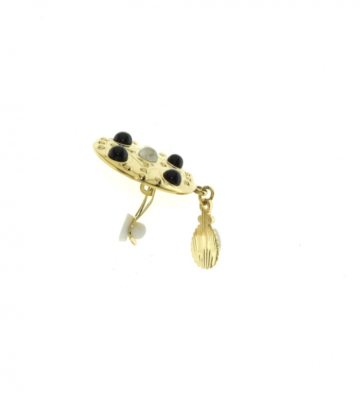 Deze goudkleurige oorclips met hanger en zwarte steentjes stralen tijdloze elegantie uit. Het verfijnde ontwerp maakt ze geschikt voor zowel dagelijkse als formele gelegenheden.