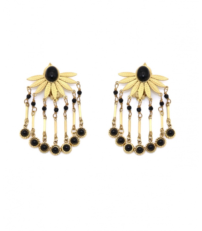 Oorclips zijn een elegant alternatief voor oorbellen zonder gaatjes. Deze goudkleurige oorclips met zwarte steentjes combineren tijdloze klasse met moderne flair. De glanzende afwerking en subtiele hangertjes maken ze geschikt voor zowel dagelijkse outfits als feestelijke gelegenheden. De zwarte steentjes vangen het licht op een verfijnde manier, waardoor je look een extra dimensie krijgt.