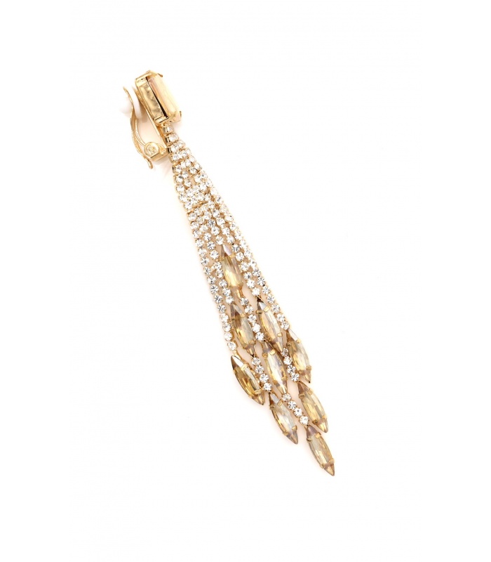 Hoe steel je de show zonder oor gaatjes? Deze glamoureuze oorclips met fonkelende strass en goudkleurige accenten trekken meteen alle aandacht. De lange lijnen met marquise geslepen steentjes creeren een elegant vallend effect dat elke beweging vangt.