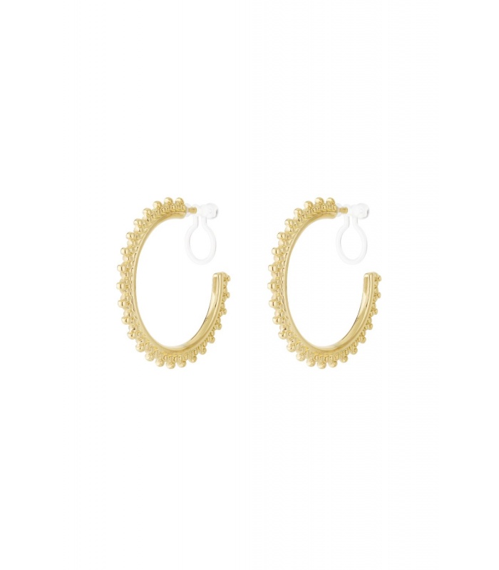 Deze goudkleurige oorclips bewijzen van wel. De subtiele ronde vorm krijgt extra karakter door het verfijnde bolpatroon langs de rand. Een klassieke look met een moderne twist perfect voor wie houdt van tijdloze elegantie zonder gaatjes.
