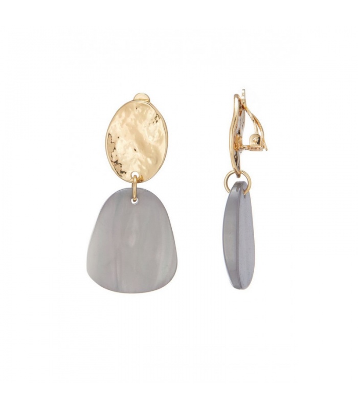 Deze oorclips combineren een goudkleurig oorstuk met een grijze iriserende hanger. Het design straalt een verfijnde en moderne elegantie uit, perfect om je outfit een stijlvolle touch te geven. Dankzij de clipstijl zijn deze oorclips ideaal voor wie geen gaatjes heeft, maar toch wil stralen met bijzondere sieraden.