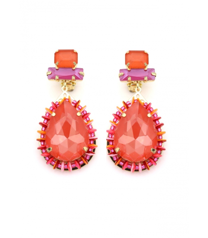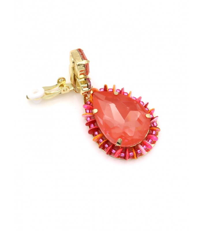 Wil je sprankelen bij elke beweging? Deze oorclips combineren een felrode druppelsteen met een omlijsting van roze en oranje kralen, wat zorgt voor een levendige, luxueuze look. Perfect voor feestjes of een opvallende touch bij je dagelijkse outfit. Een echte eyecatcher in de wereld van statement oorbellen.