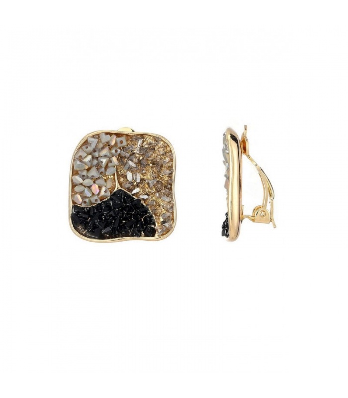 Zoek je oorclips met een luxe uitstraling en een krachtige mix van kleuren? Deze vierkante oorclips combineren zwart, taupe en parelmoertinten in een speels mozaiek. De gouden omlijsting maakt het geheel extra chic.