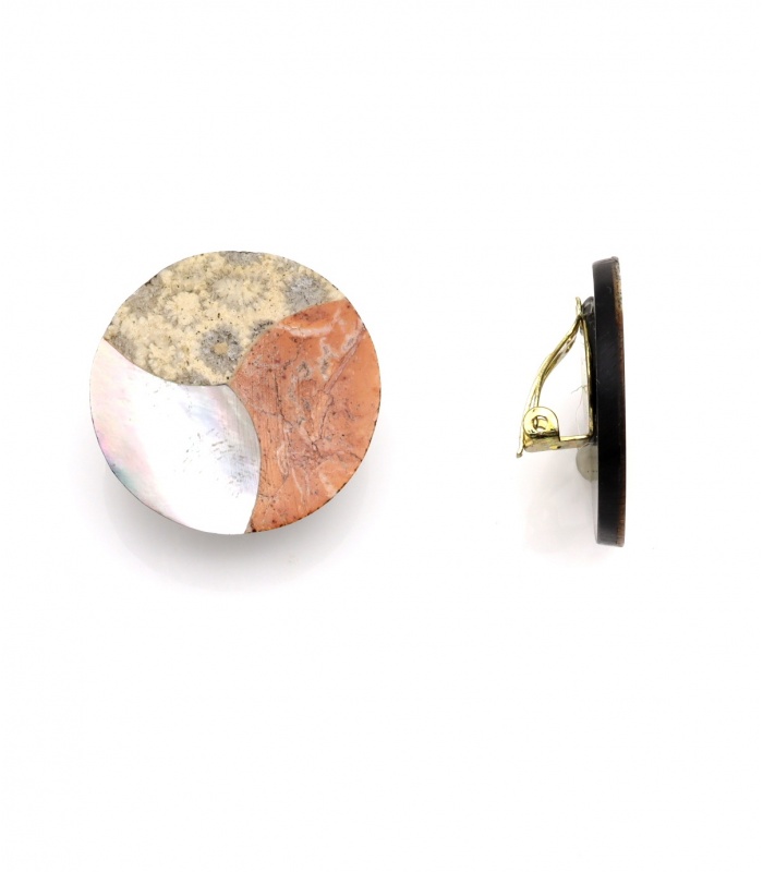 Klaar om je look een unieke twist te geven? Deze ronde oorclips combineren, parelmoer en marmer in een opvallend grafisch design. Het contrast tussen de warme tinten en het koele glansoppervlak geeft elke outfit een stijlvolle uitstraling. Perfect voor wie houdt van natuurlijke materialen en fashion statement.