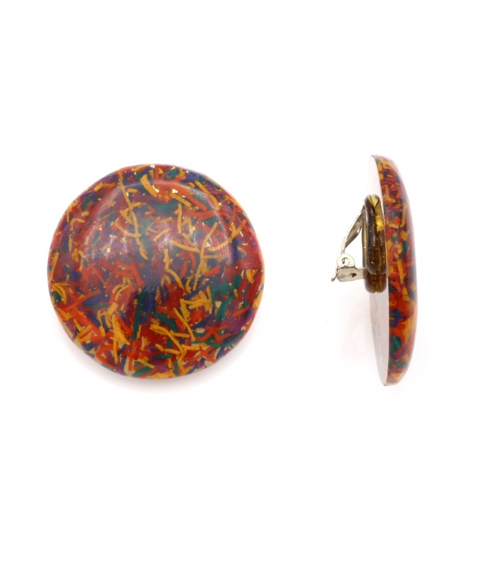 Wil je kleur en speelsheid toevoegen aan je look? Deze oorclips barsten van energie dankzij het confetti achtige patroon in rood, geel, groen en zwart. Het glanzende oppervlak en de ronde vorm maken het een opvallend accessoire dat elke outfit tot leven brengt.