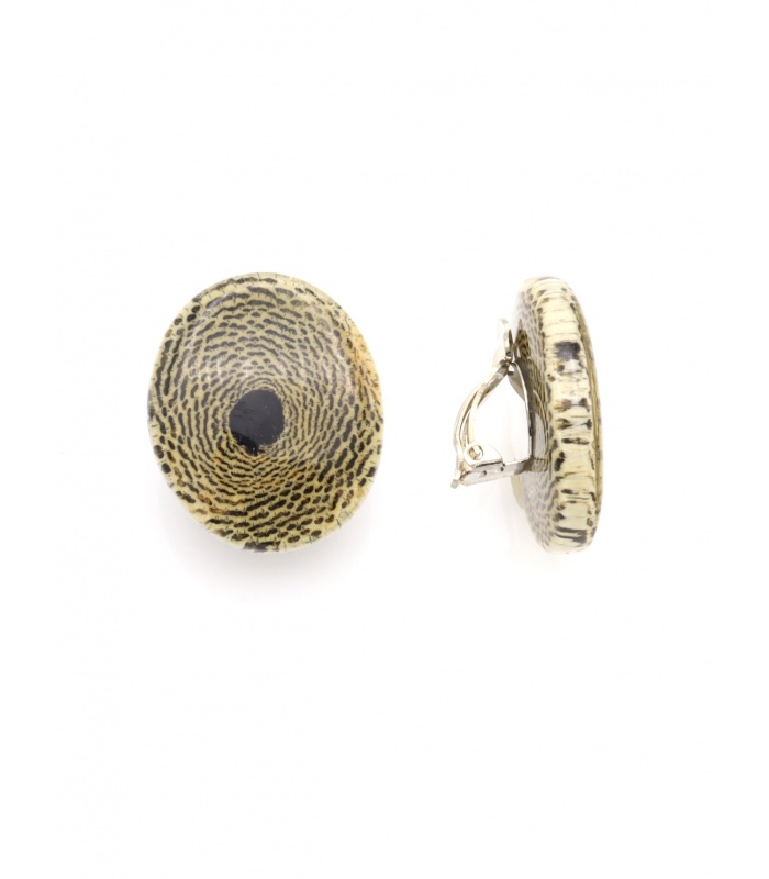 De mix van beige en zwart in een spiraalprint doet denken aan een moderne slangen of tijgerhuid. Gemaakt van licht materiaal en voorzien van stevige clips, draag je deze statement oorbellen de hele dag comfortabel. Combineer ze met een leren jasje of neutrale tinten voor maximale impact.