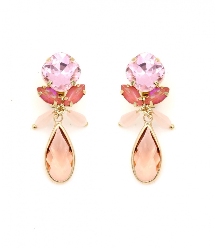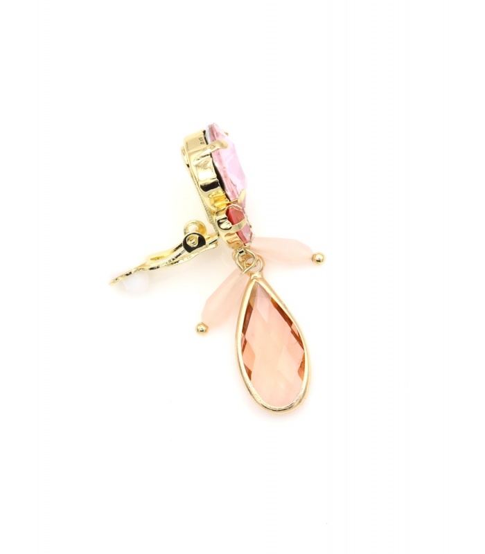 Wil je een elegante touch zonder in te leveren op kleur? Deze oorclip combineert zachte roze tinten met een vleugje abrikoos in een verfijnde druppelvorm. De mix van glanzende glasstenen en goudkleurige details geeft je look direct een vrouwelijke upgrade. Perfect bij pastel fashion.