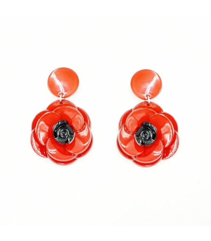 Donker rode oorclips met bloemvormige hanger van Belle Miss.