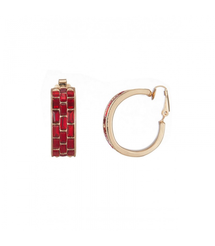 Deze goudkleurige creolen oorclips stralen luxe en elegantie uit. De opvallende rode glas steentjes geven een speelse twist aan het klassieke ontwerp, waardoor ze perfect passen bij zowel casual als chique outfits. Dankzij het oorclipsysteem zijn ze ideaal voor mensen zonder gaatjes in de oren. De subtiele, maar sprankelende rode glasstenen vangen het licht prachtig, wat zorgt voor een verfijnde glamour.