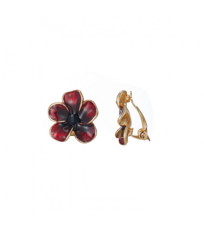 Op zoek naar oorclips die je look een speelse maar elegante twist geven? Deze oorclip in bloemvorm combineert warme roodtinten met een goudkleurige omlijsting. Het zwarte kristal in het midden zorgt voor extra diepte en een chique accent.