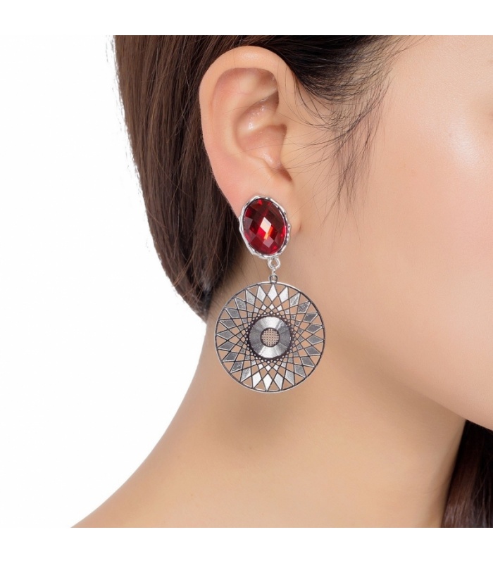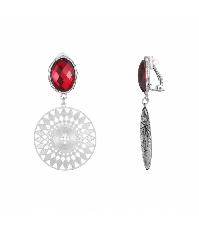 Rode facet kraal oorclip met ronde zilverkleurige hanger.