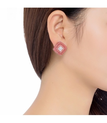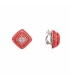 Rode vierkante oorclips met rode kralen en heldere witte strass steentjes.
