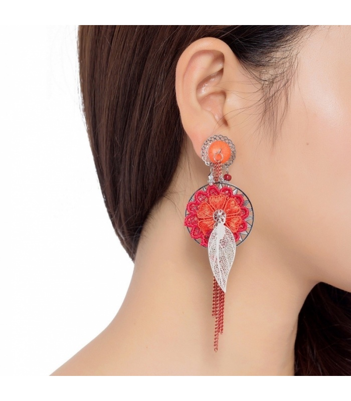 Zilverkleurige oorclips met rode bloem van stof en metalen blad en kleine kraaltjes