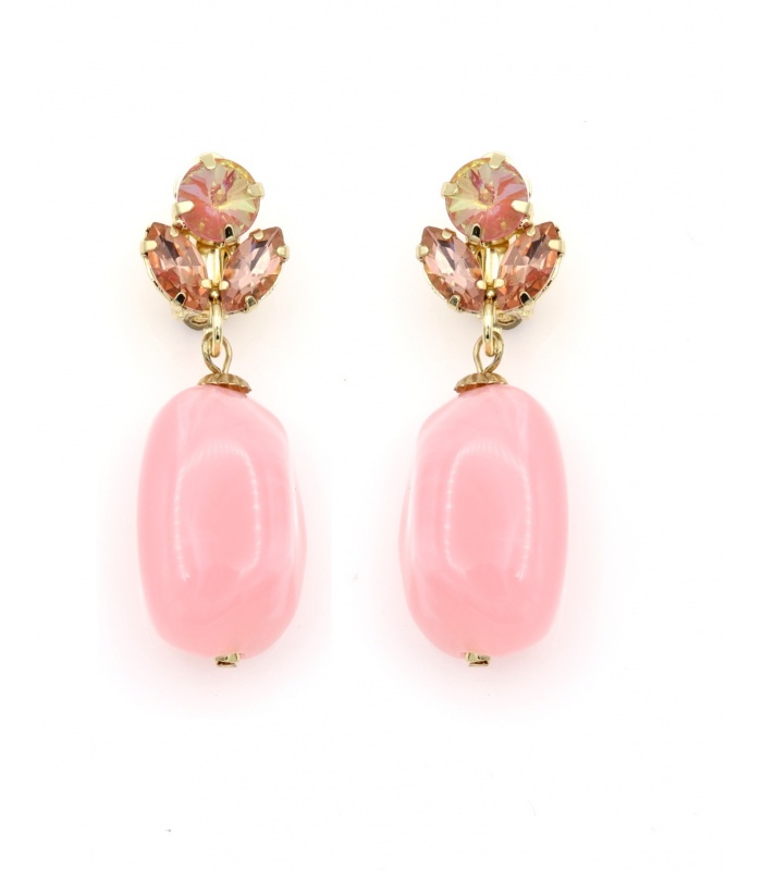 Hoe voeg je een vleugje romantiek toe aan je look zonder gaatjes? Deze oorclips combineren een glanzende roze kraal met fonkelende kristallen in roze tinten. De lichtgouden setting geeft het geheel een vrouwelijke elegantie.