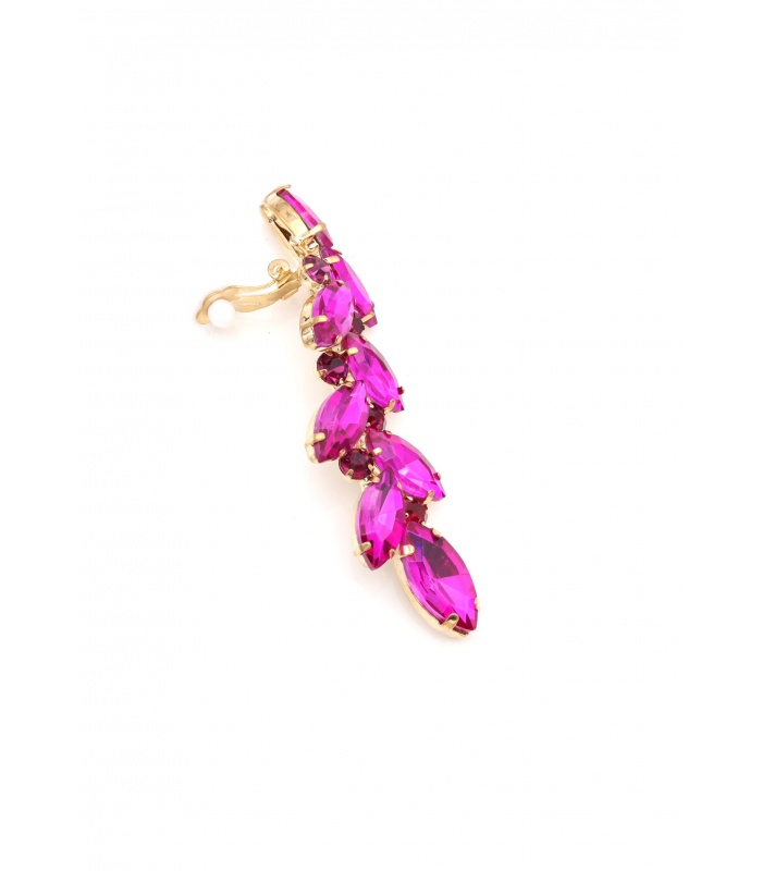 Deze oorclips zijn opvallend en elegant vormgegeven met felroze, bladvormige kristallen die in een vloeiende verticale lijn zijn geplaatst. De stenen hebben een marquise slijpvorm, wat zorgt voor een luxe uitstraling en een schitterend lichtspel bij beweging. Tussen de grotere kristallen zijn kleinere ronde roze steentjes verwerkt voor extra glans en diepte.