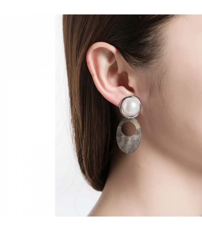Oorclips met halve kunstparel en ovale hanger van parelmoer.