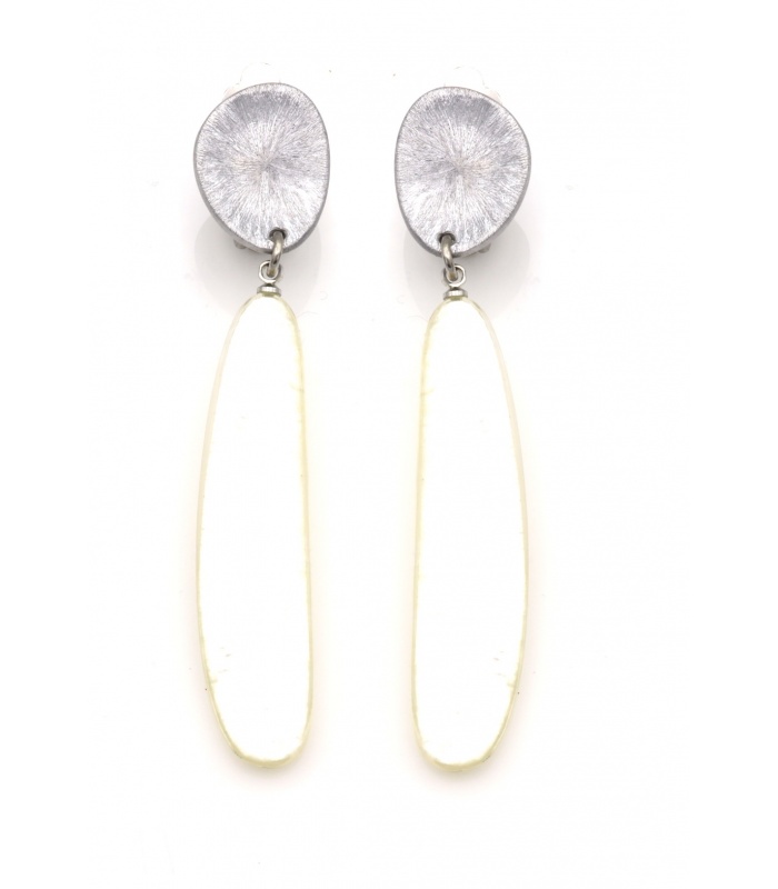 Zoek je oorclips die lengte en verfijning toevoegen aan je look? Deze zilverkleurige oorclips combineren een matte, ronde bovenkant met een langwerpig wit hangend element. Een stijlvol ontwerp dat moeiteloos een moderne uitstraling geeft.