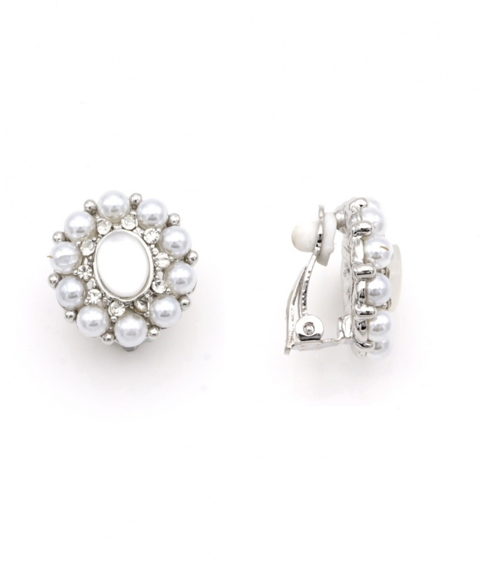 Zoek je oorclips die klasse uitstralen? Deze ronde oorclips combineren een centrale ovale steen met een rand van glanzende imitatieparels en fonkelende strass. Een stijlvol ontwerp dat perfect past bij zowel feestelijke als formele gelegenheden.