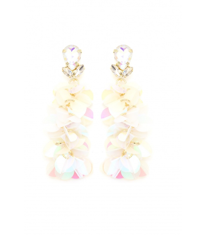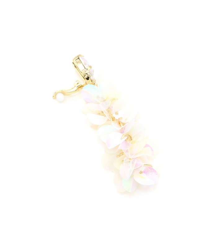 Hoe combineer je subtiele glans met opvallende flair? Deze witte oorclips doen het moeiteloos. De iriserende schijfjes vangen elk licht en reflecteren pastelkleuren die je look doen oplichten. Perfect voor bruiloften, feestjes of een stijlvolle avond uit. De kristalvormige steen aan de bovenzijde geeft net dat extra beetje sprankel dat je outfit compleet maakt.