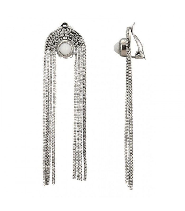 Oorclips met lange zilverkleurig kettingfranjes en wit steentje