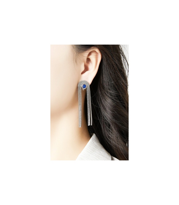 Hoe creëer je een moderne look die toch elegant blijft? Deze zilverkleurige oorclips met lange kettingfranjes en een subtiele witte steen geven een fris, grafisch effect. De boogvormige basis zorgt voor een stijlvol accent, terwijl de franjes bij elke beweging luchtig meedansen.