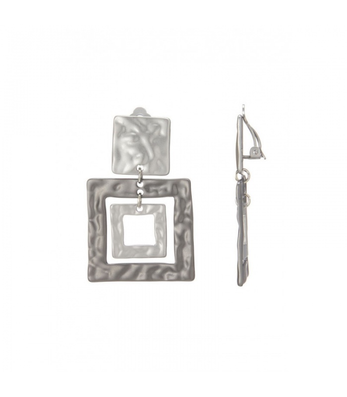Wil je opvallen met een geometrische blikvanger? Deze zilverkleurige oorclips bestaan uit drie vierkante elementen in een speels, open ontwerp. De gehamerde afwerking geeft het strakke lijnenspel een organische textuur, waardoor de oorclips zowel modern als uniek aanvoelen.