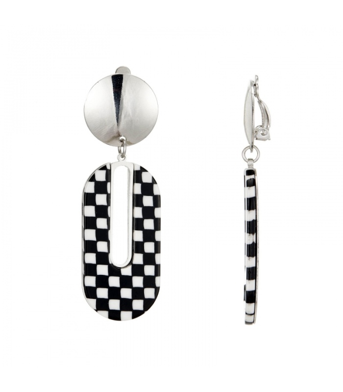 Zilverkleurige langwerpige oorclips met zwart witte inleg van Belle Miss.
