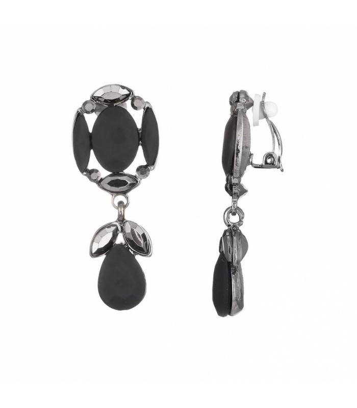 Zwarte oorclips gemaakt van hars met grijze kristal steentjes