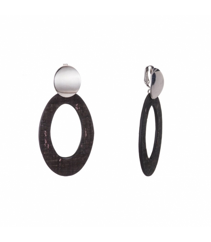 Zwarte oorclips met een ovale hanger en een zilverkleurig oorstukje