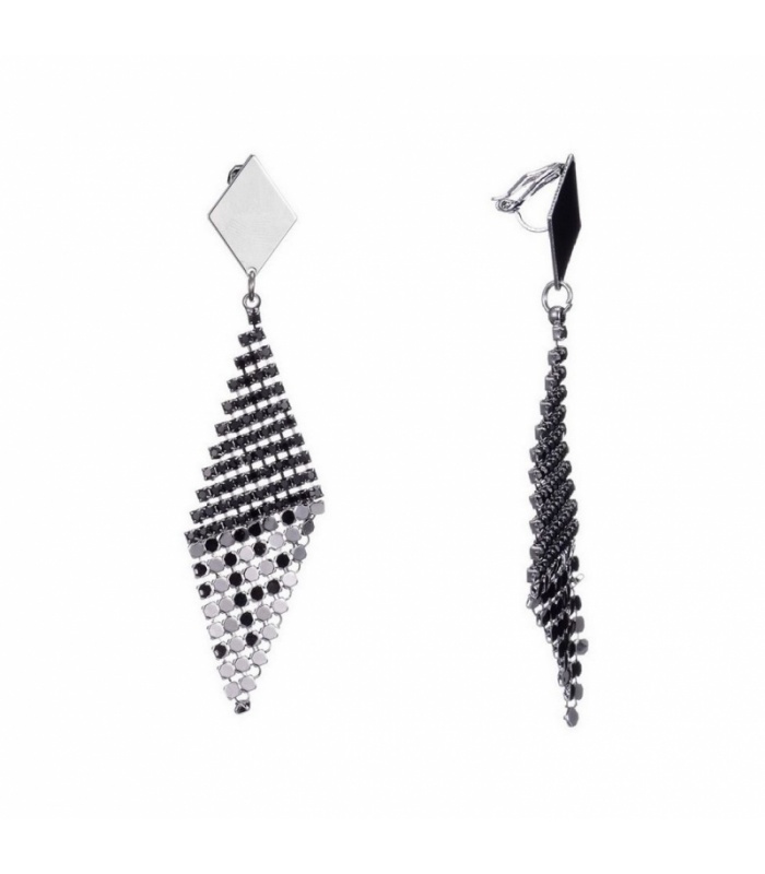 Zwarte oorclips met strass steentjes en metalen rondjes als hanger.