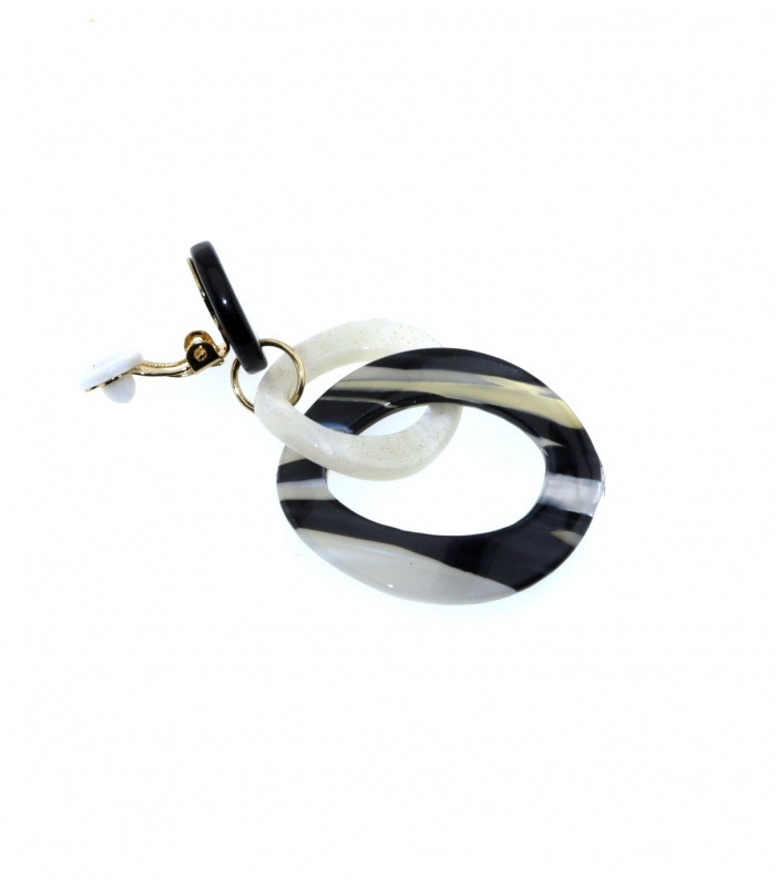 Deze stijlvolle oorclips combineren een zwart oor stukje met een witte hanger voorzien van een uniek motief. Het contrast tussen het zwarte oorstukje en de witte hanger met motief zorgt voor een opvallende en modieuze uitstraling. Perfect voor zowel dagelijkse outfits als speciale gelegenheden.