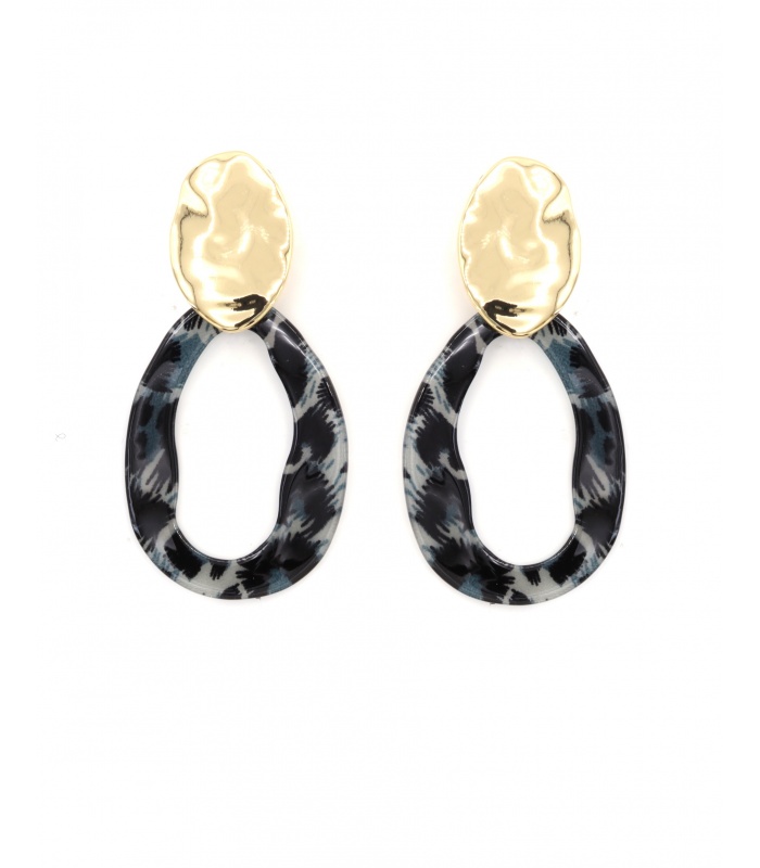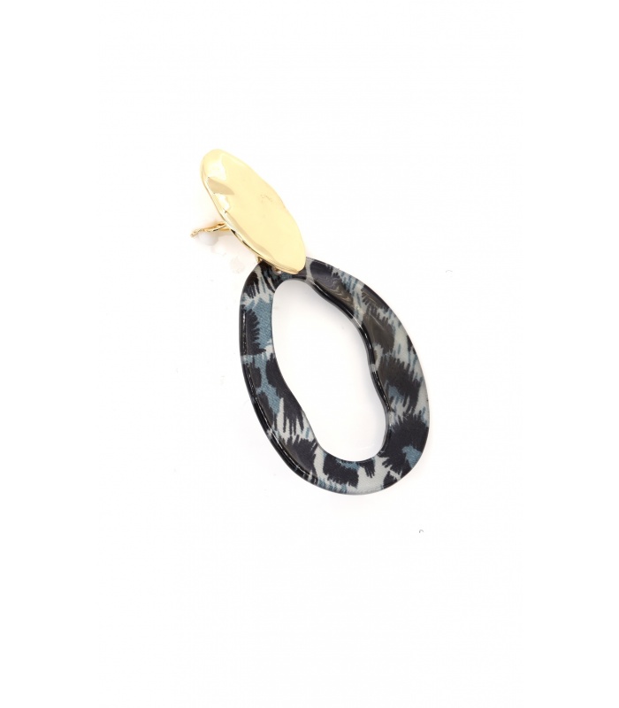 Wil je een oorbel die elegantie en karakter combineert? Deze oorclip met gemarmerde ovalen ring in grijs en zwarttinten en een goudkleurige bovenkant zorgt voor een opvallende, moderne look. Perfect bij zowel casual als geklede outfits.