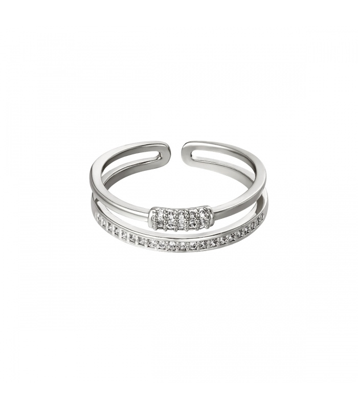Zilverkleurige dubbele ring met witte zirkoonsteentjes.
