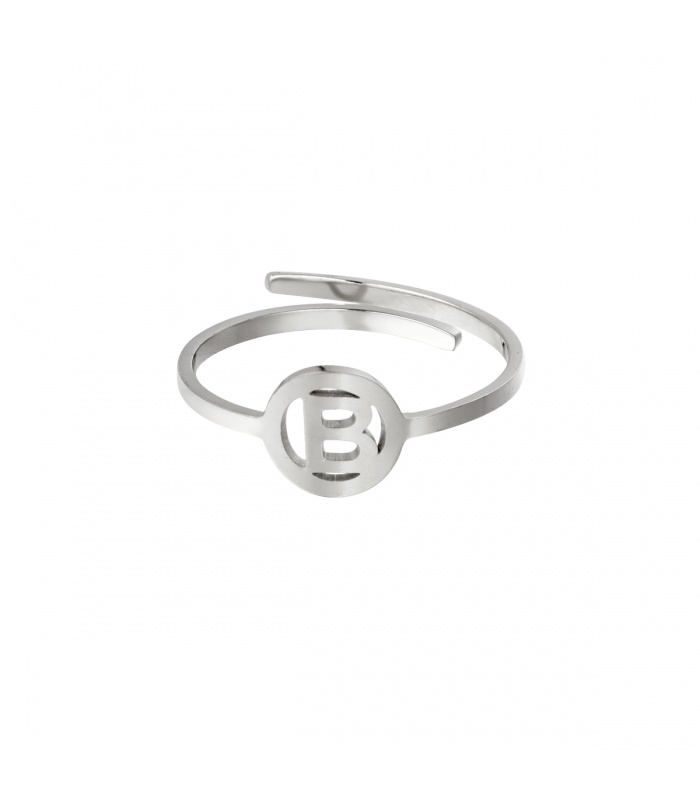 Zilverkleurige ring met initiaal B in cirkel.