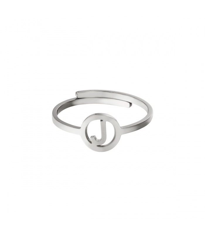 Zilverkleurige ring met initiaal J in cirkel.